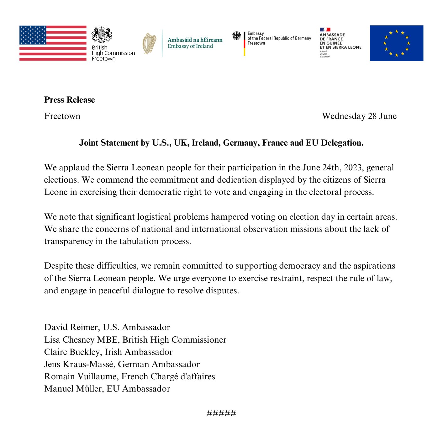 https://sierraleonelive.com/download/8081/?tmstv=1688013147 - The UK, US Bureau of African Affairs, and the joint statement by the U.S., UK, Ireland, Germany, France, and EU Delegation all highlighted their concerns over the lack of transparency in the tabulation process, despite their commendation for the citizens’ dedication to democratic processes. Their support for democracy resonates with the book’s echo of the nation’s “unyielding faith in democracy”. (UK, US Bureau of African Affairs)Download The Joint Statement